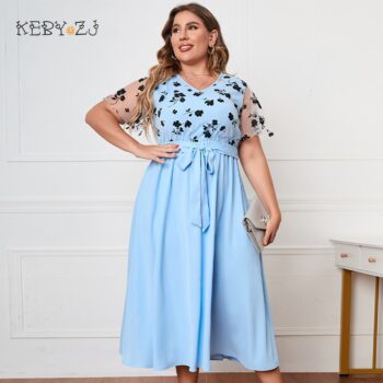 KEBY ZJ 3XL 4XL Plus Size Women Clothing Lace Short Sleeve Long Dress Summer V-Neck Belt Blue Floral Print Lady Big Size Dresses